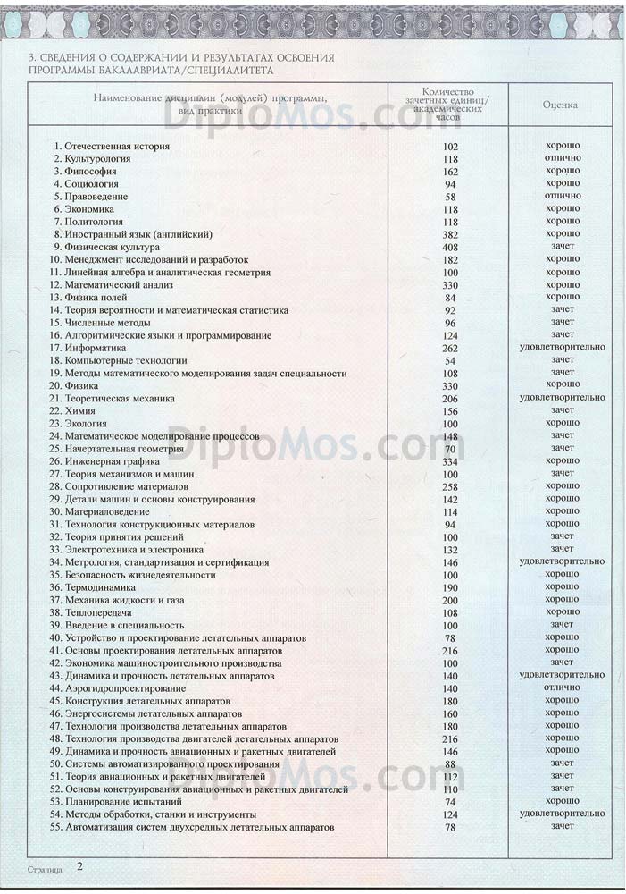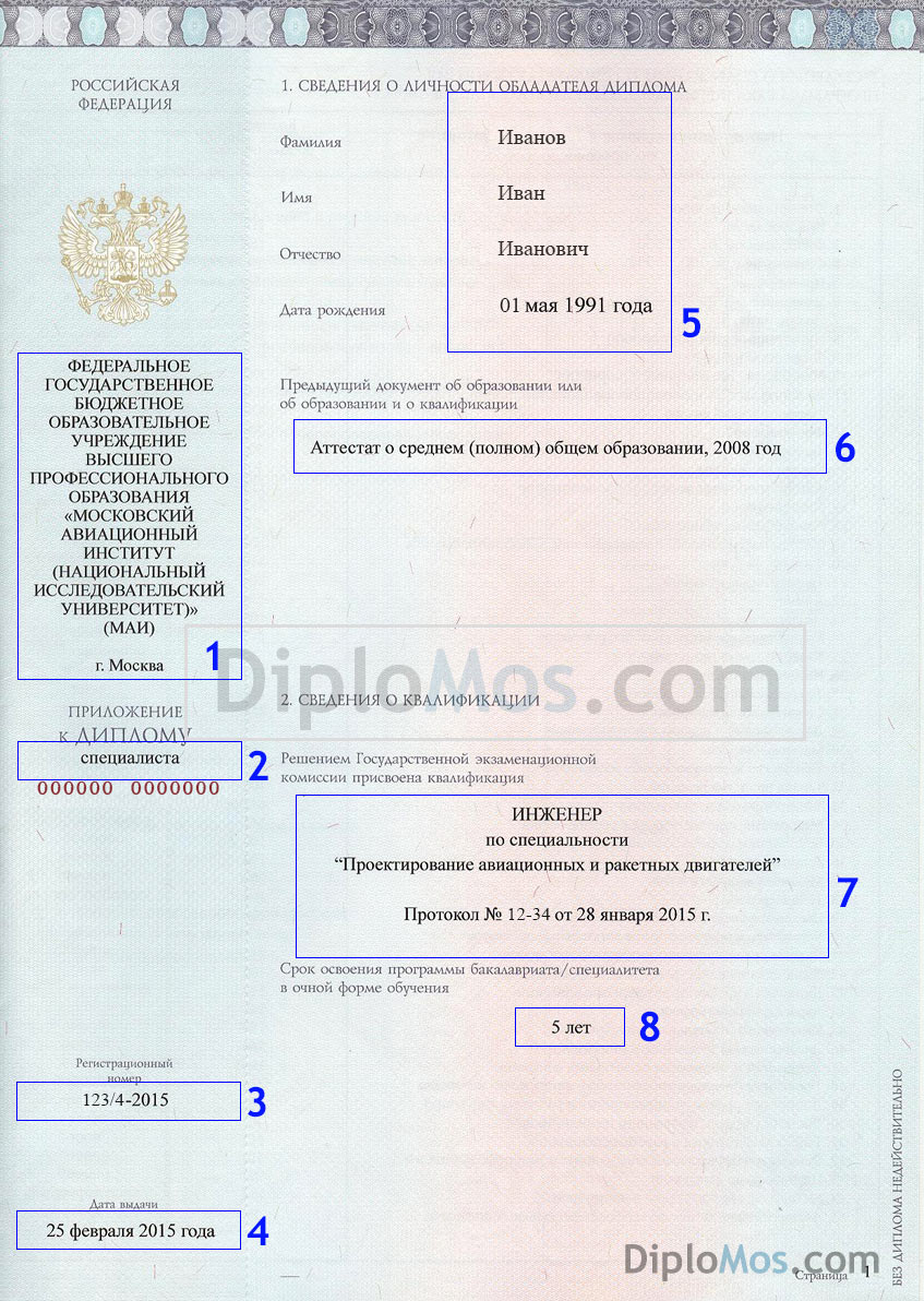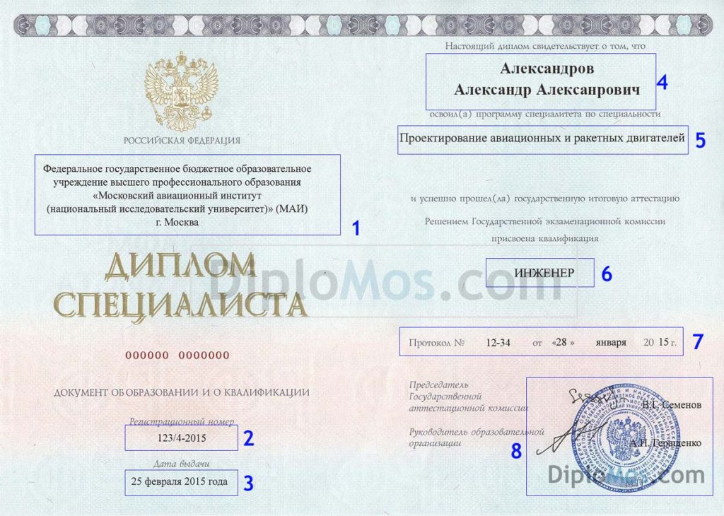 №1. После надписи «РОССИЙСКАЯ ФЕДЕРАЦИЯ» на отдельной строке — полное официальное наименование организации (согласно уставу), выдавшей диплом (Здесь: Федеральное бюджетное образовательное учреждение высшего профессионального образования «Московский авиационный институт (национальный исследовательский университет)« (МАИ)); далее — наименование населенного пункта, в котором находится учебное заведение (Здесь: г. Москва).