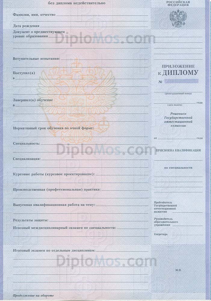 Диплом: Полный комплект с обложкой и приложением, заполненный, как в ССУЗе